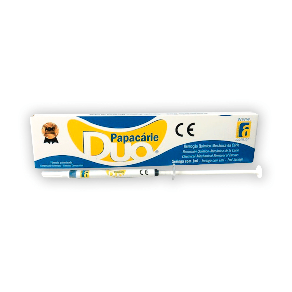 Propriedades: As lesões de cárie em dentina surgem como conseqüência da ação de bactérias acidogênicas. A dentina acometida pela ação dessas bactérias apresenta-se em diferentes camadas. A camada mais superficial é a camada necrótica, altamente infectada pela penetração bacteriana e sem sensibilidade. Esta camada da dentina mostra-se amolecida e sem possibilidade de reorganização devido à denaturação irreversível das fibras colágenas. Abaixo desta camada superficial existe uma zona de desmineralização e logo abaixo a zona transparente ou esclerótica, a qual pode apresentar descoloração, porém não exibe sinais de infecção, sendo capaz de sofrer processo de regeneração. A quarta camada, localizada próxima à polpa e nas margens da lesão, é caracterizada por uma dentina de consistência um pouco mais endurecida e com grande número de túbulos. Remover esta dentina infectada e contaminada, que está desmineralizada e sem possibilidade de recuperação devido à denaturação das fibras colágenas é a finalidade do produto PAPACÁRIE DUO® , preservando ao máximo estrutura sadia.